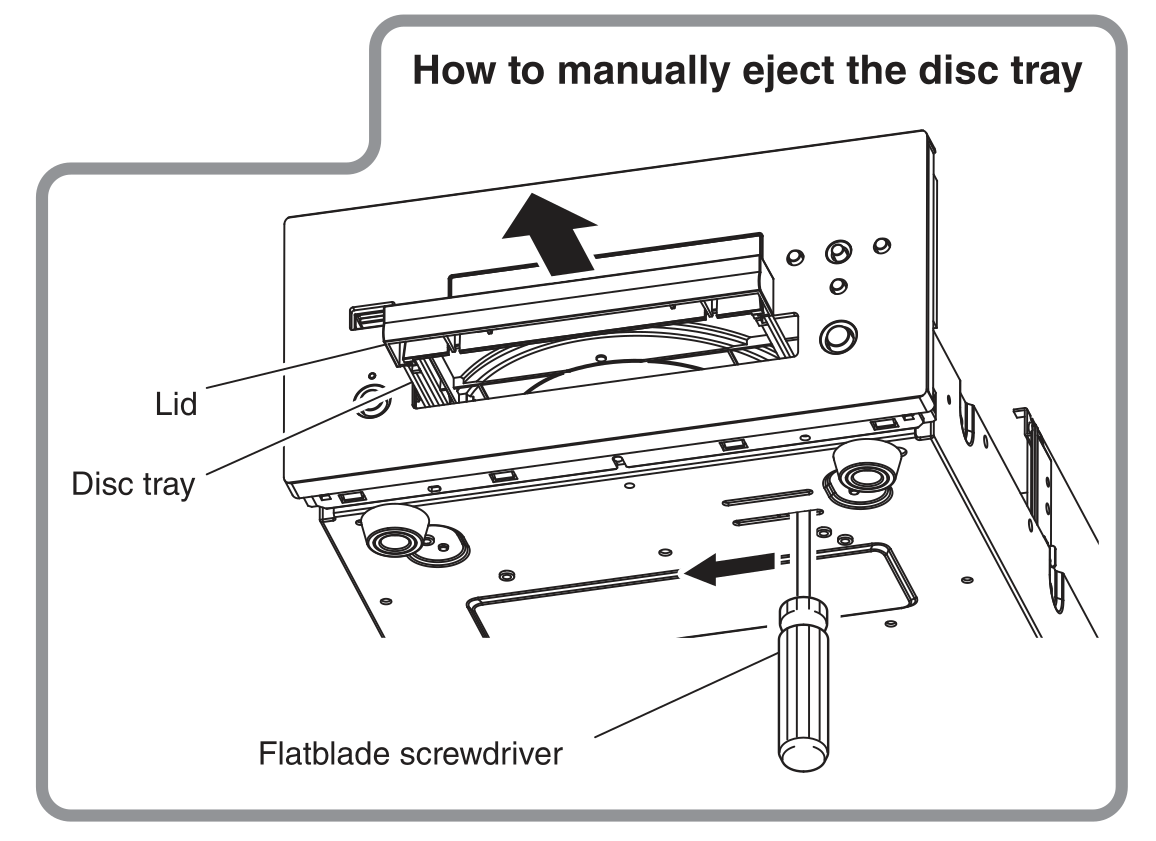 To eject disc from player without power, the manual says to slide a flat head screwdriver in the slot at the bottom.