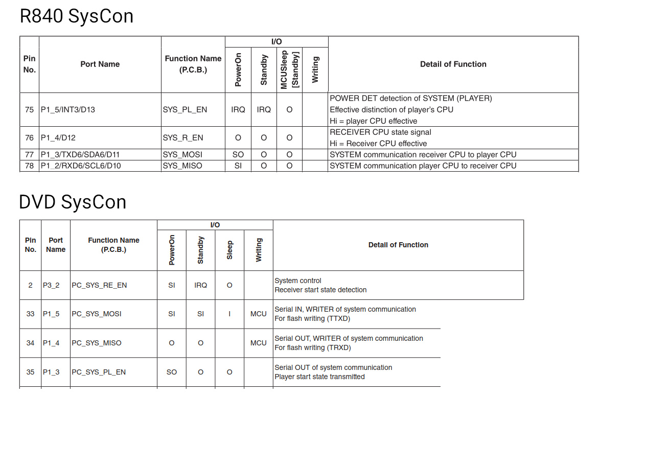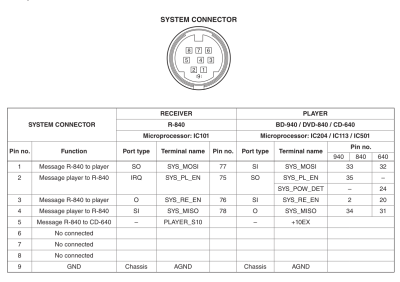 Yamaha R840 is part of Micro Component System MCR-840 and comes with either CD-Player (MCR640), DVD-Player (MCR840) or BluRay-Player (MCR940). The players are connected via RCA but need a proprietary “System Connector” cable. The remote control is different for MCR640.