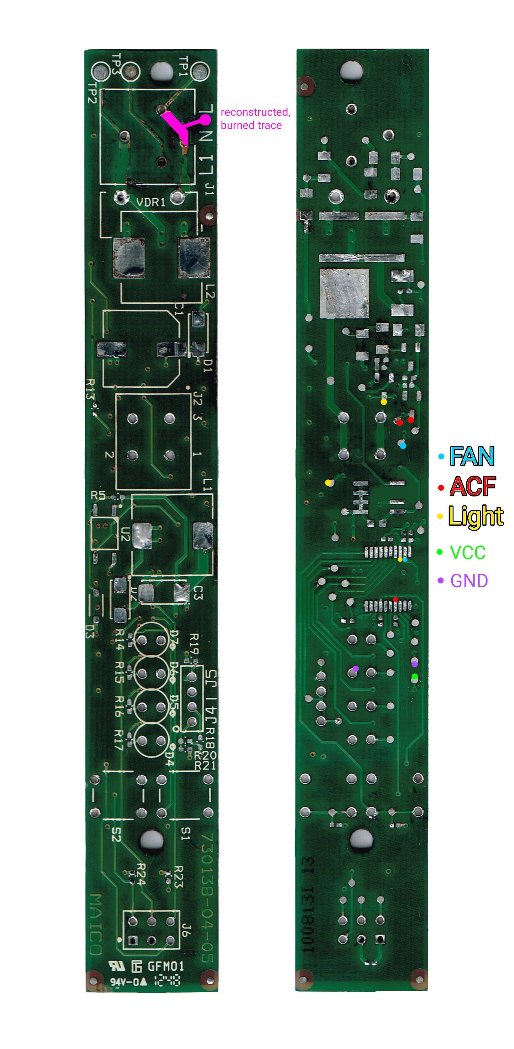 The trace of L-line was burned up of this broken PCB, I have redrawn it in pink to show the original trace.